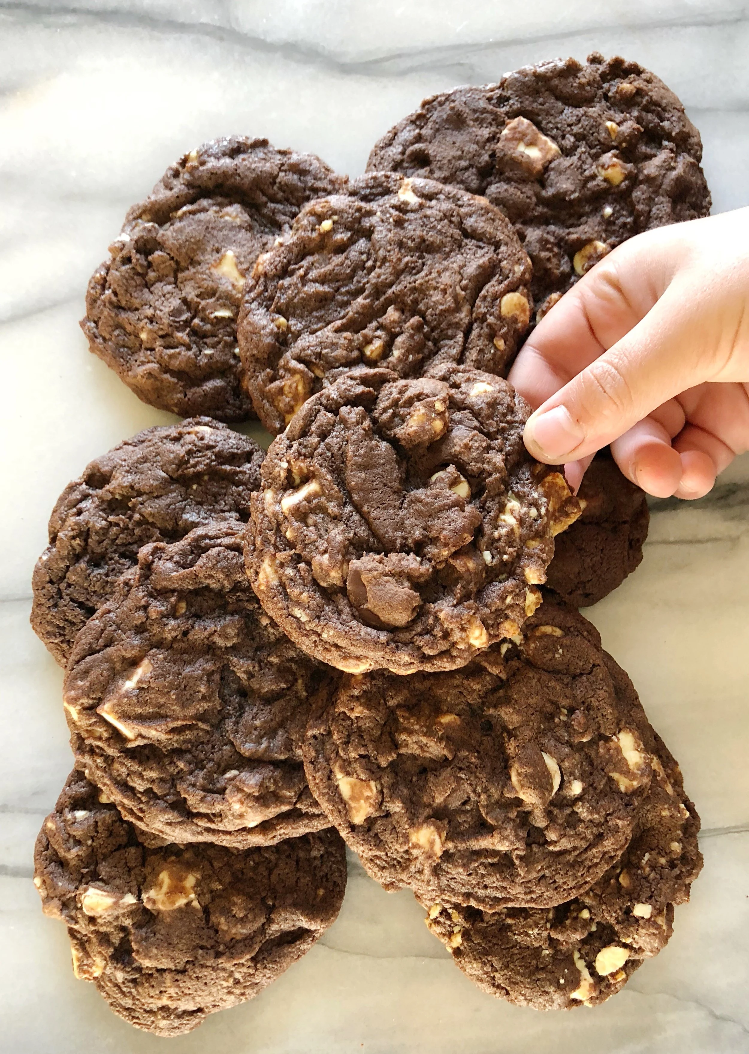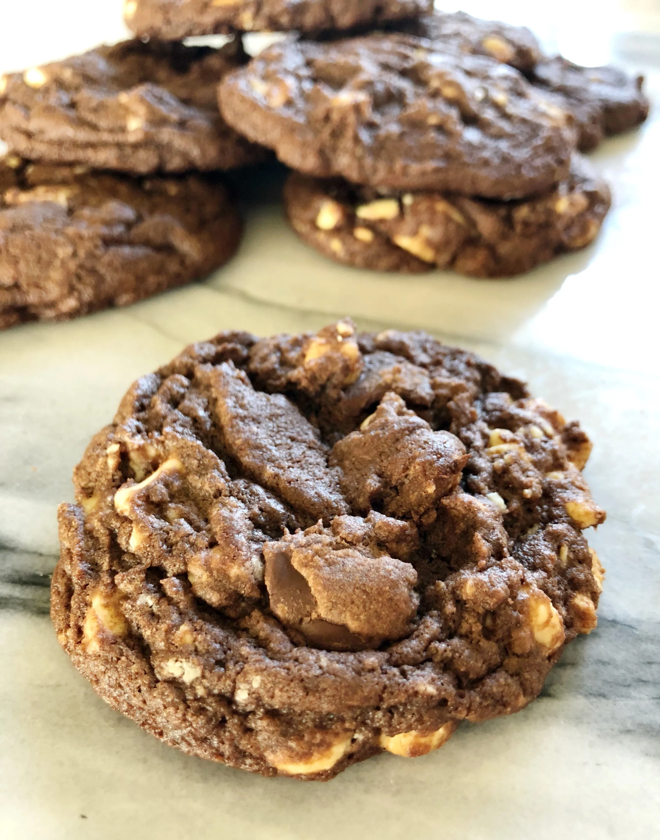 Richly decadent chocolate cookies are studded with dark and white chocolate chips as well as peppermint bark. Sometimes the peppermint bark pieces can be hard to find but I’ve had good luck at Target and Wal Mart. We make batch after batch of these special cookies all month long and gift them to neighbors and friends, take to holiday gatherings and wrap up a few in extra special paper to give our favorite teachers.