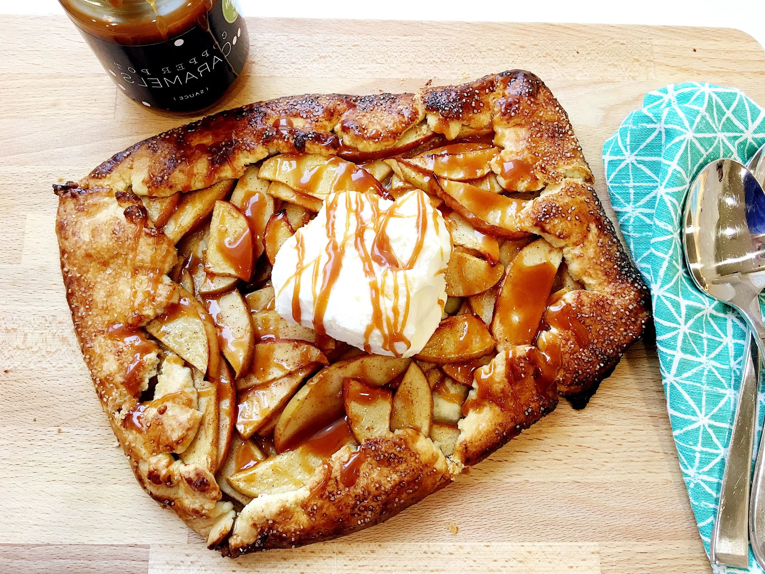 In a small bowl, whisk the egg yolk with a tiny splash of water and brush the crust with the egg. Sprinkle with raw sugar and bake in the oven for 25-30 minutes until the crust is golden brown. When it comes out of the oven, let it cool for a minute or two and then drizzle the entire thing in caramel sauce.