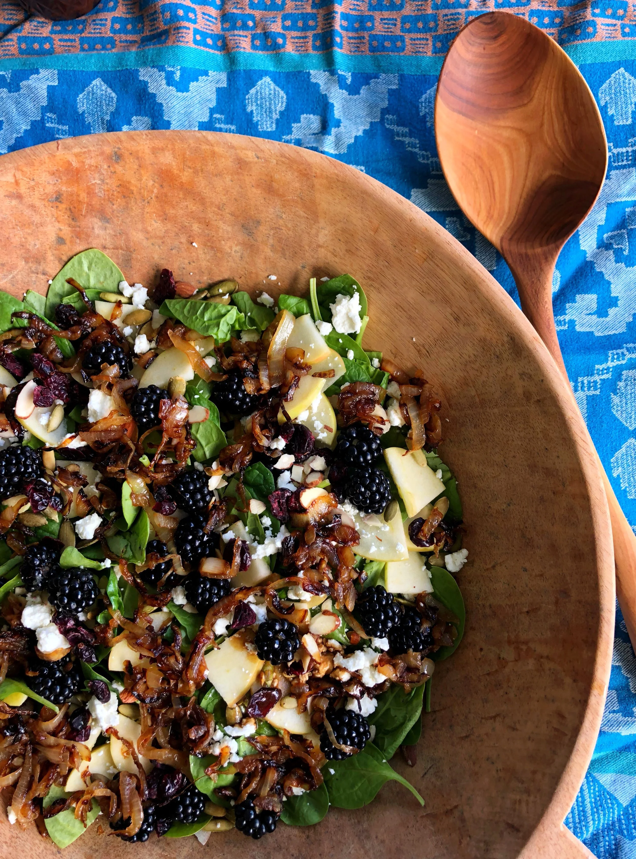 This salad is the epitome of how I love to cook and eat. Fresh, simple and easy but a little surprising too. The caramelized onions give the salad a rich hearty flavor and balances out the tang of the goat cheese and tart crisp apple. Sweet blackberries and crunchy almonds add just the right flavor and texture.
