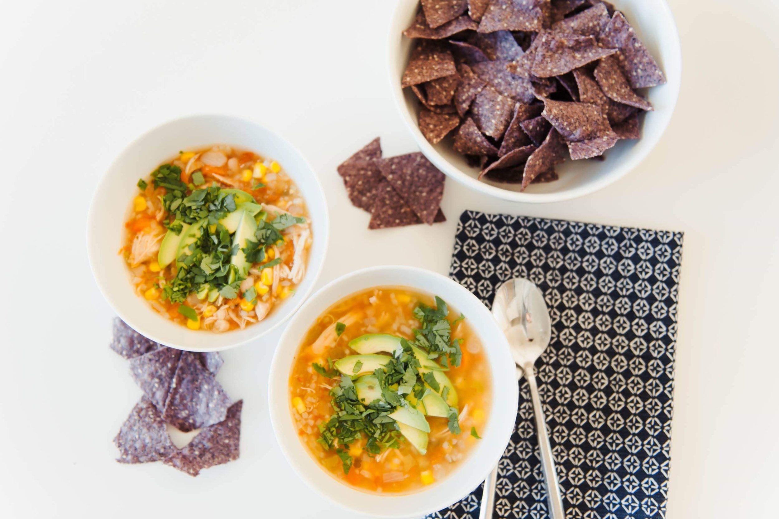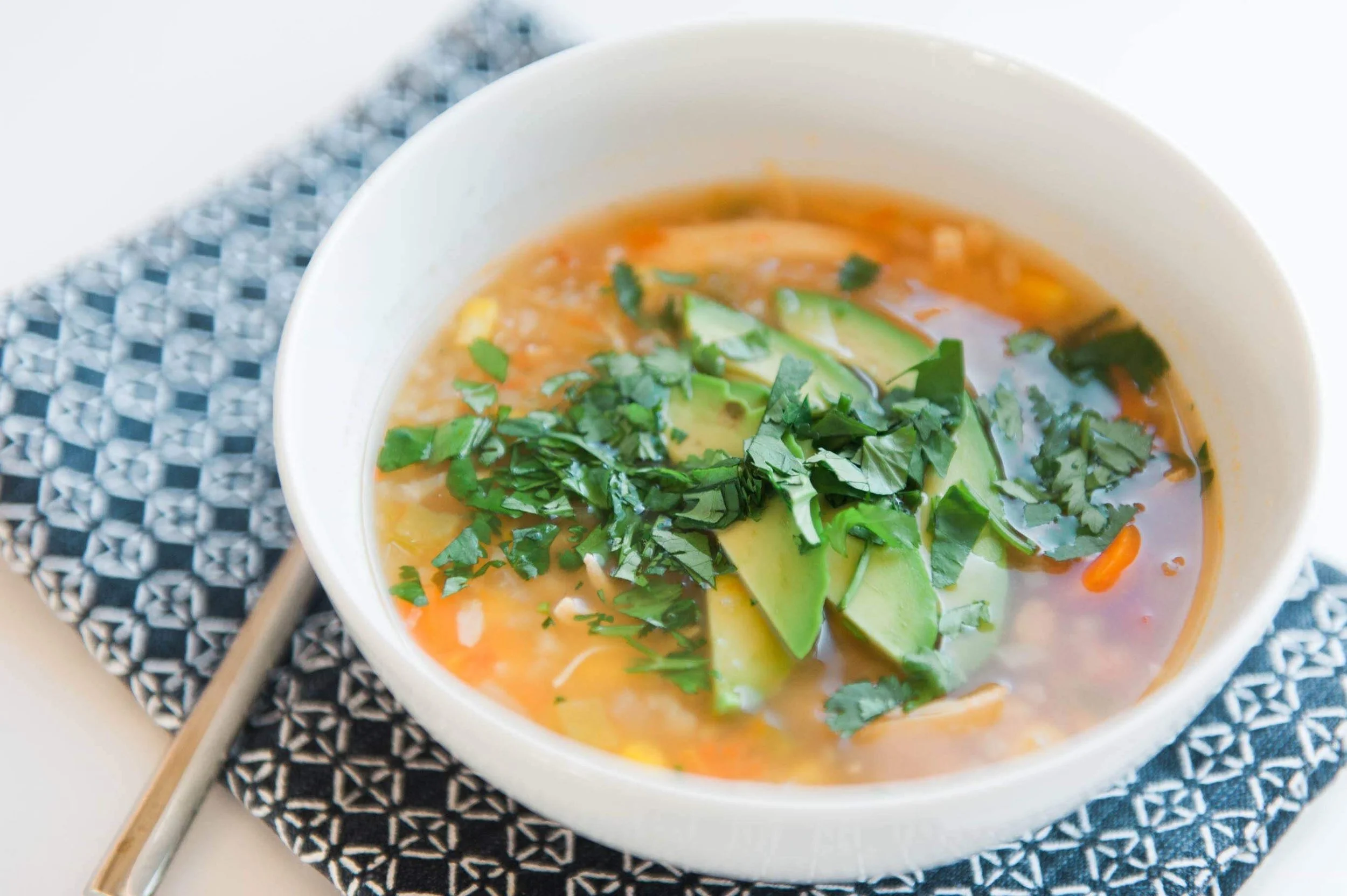 To serve, ladle soup into bowls. Top with slices of avocado, fresh chopped cilantro, a squeeze of fresh lime and a dollop of fat-free sour cream. Serves 6-8 generous portions.