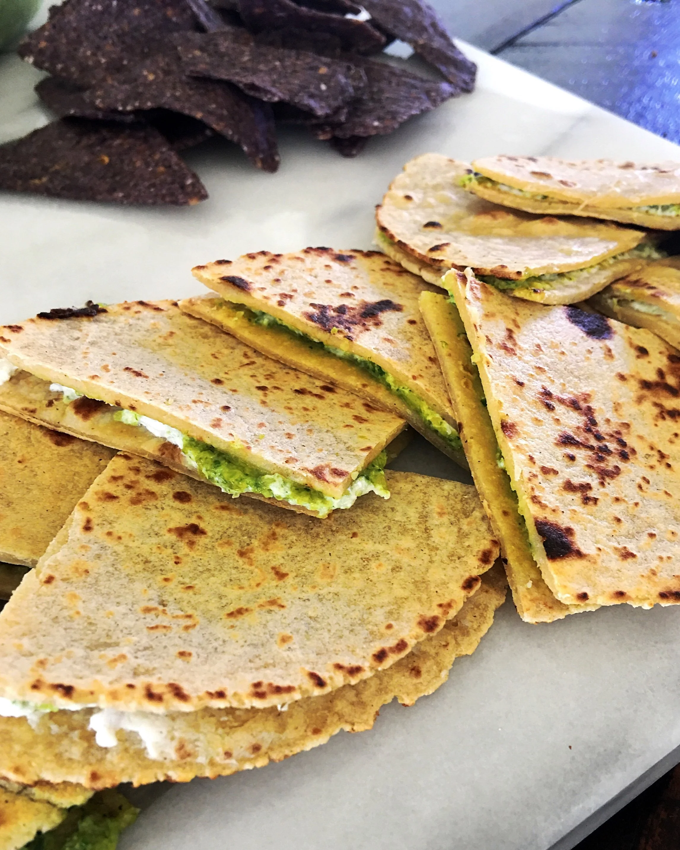To make the quesadillas: Heat a griddle or large skillet over medium-high heat. Warm the corn tortillas until they are warm and soft. Remove from heat, spread with goat cheese and pesto and top with another tortilla. Return the quesadilla to the griddle and cook until the tortilla is crisp and the cheese is melted and bubbling, about 2 minutes. Transfer the quesadillas to a cutting board and cut into quarters. Serve immediately.