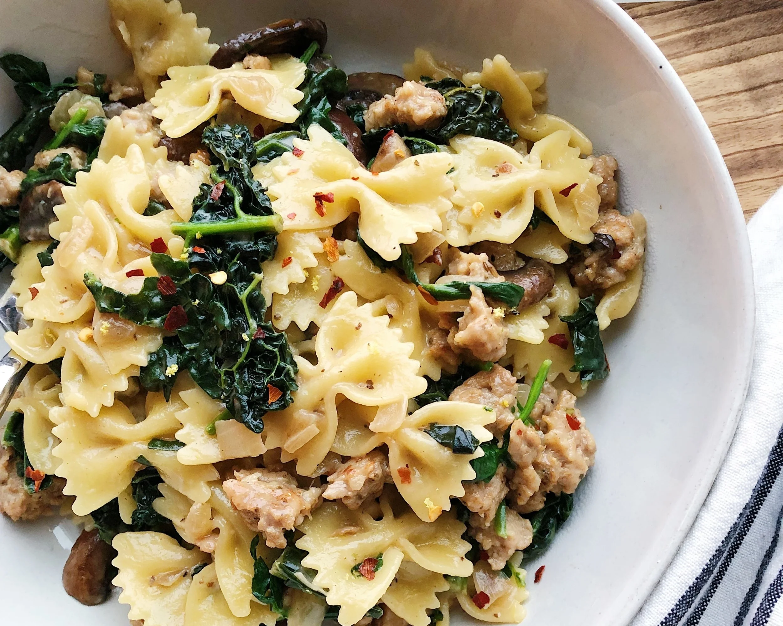 When the kale is dark green and wilted and the mushrooms are tender, about 8 to 10 minutes, stir in the spinach and cook for one more minute. Add the sausage back to the pan, stir well and turn off the heat.