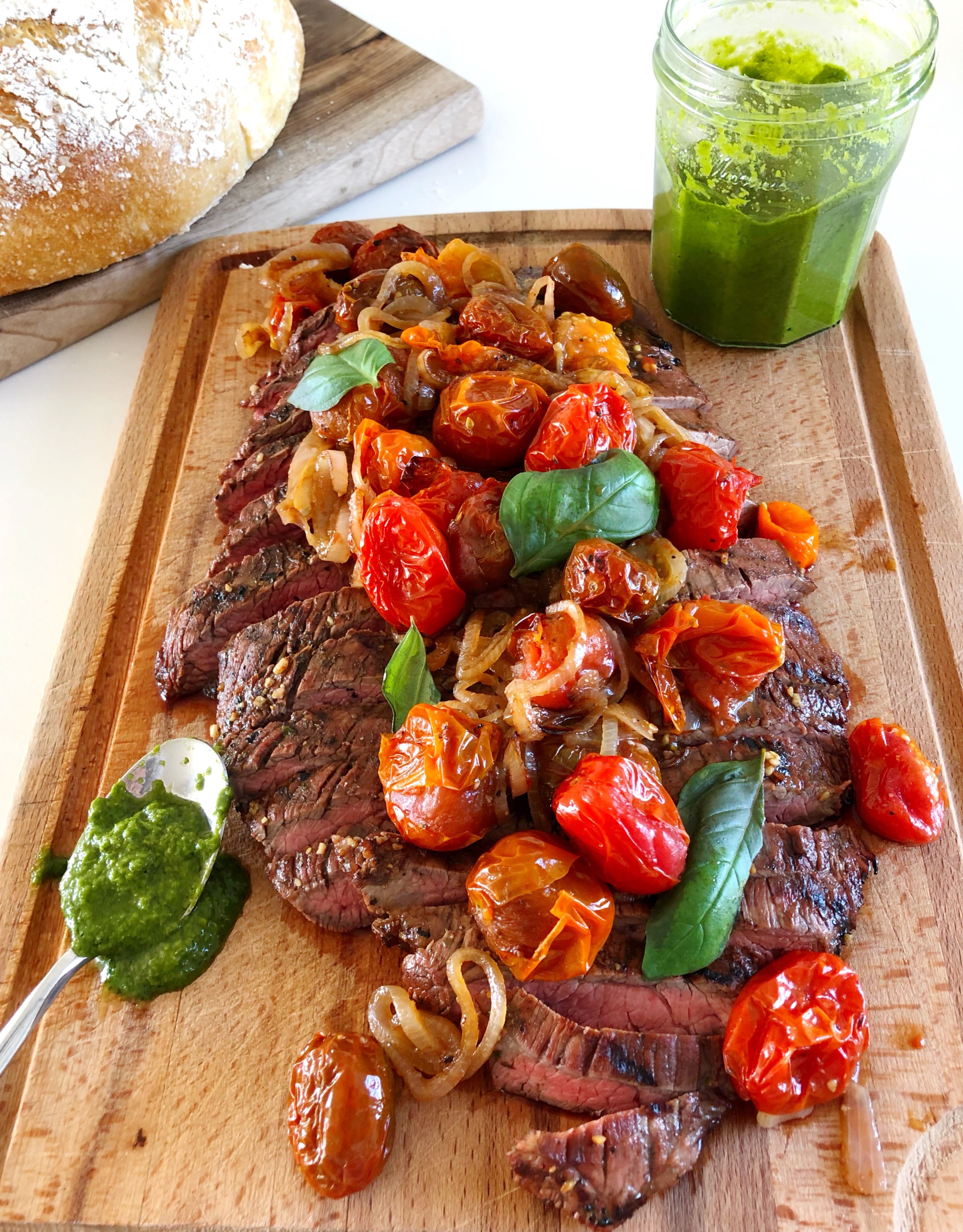 Flank Steak with Roasted Cherry Tomatoes and Herb Vinaigrette (recipe adapted from What’s Gaby Cooking)