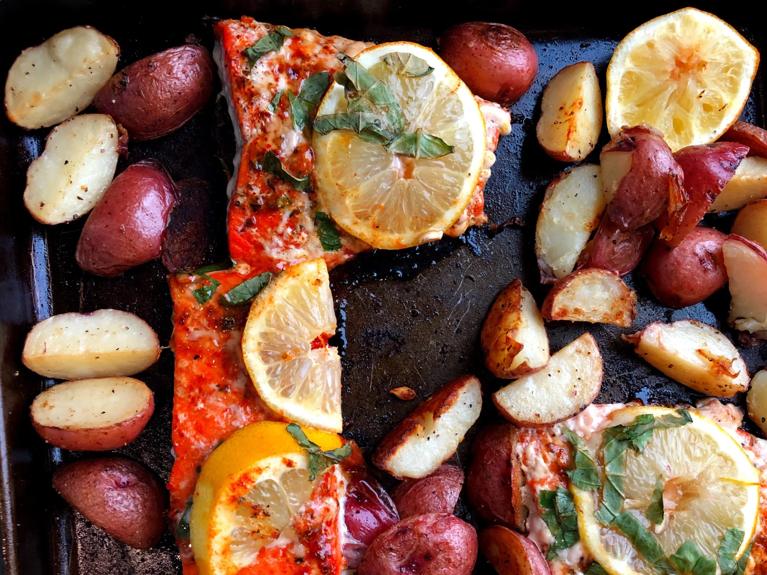 Remove the potatoes from the oven (the potatoes won’t be fully-cooked yet) and add the salmon fillets to the baking sheet. Garnish the entire tray with lemon zest and the chopped fresh basil. Squeeze lemon juice over the salmon fillets. Cut the used lemon into rounds and place them on the salmon. Return the tray to the oven or barbecue and cook for an additional 10 to 15 minutes depending on your preference. The salmon is cooked through when the flesh easily flakes with a fork. Enjoy!