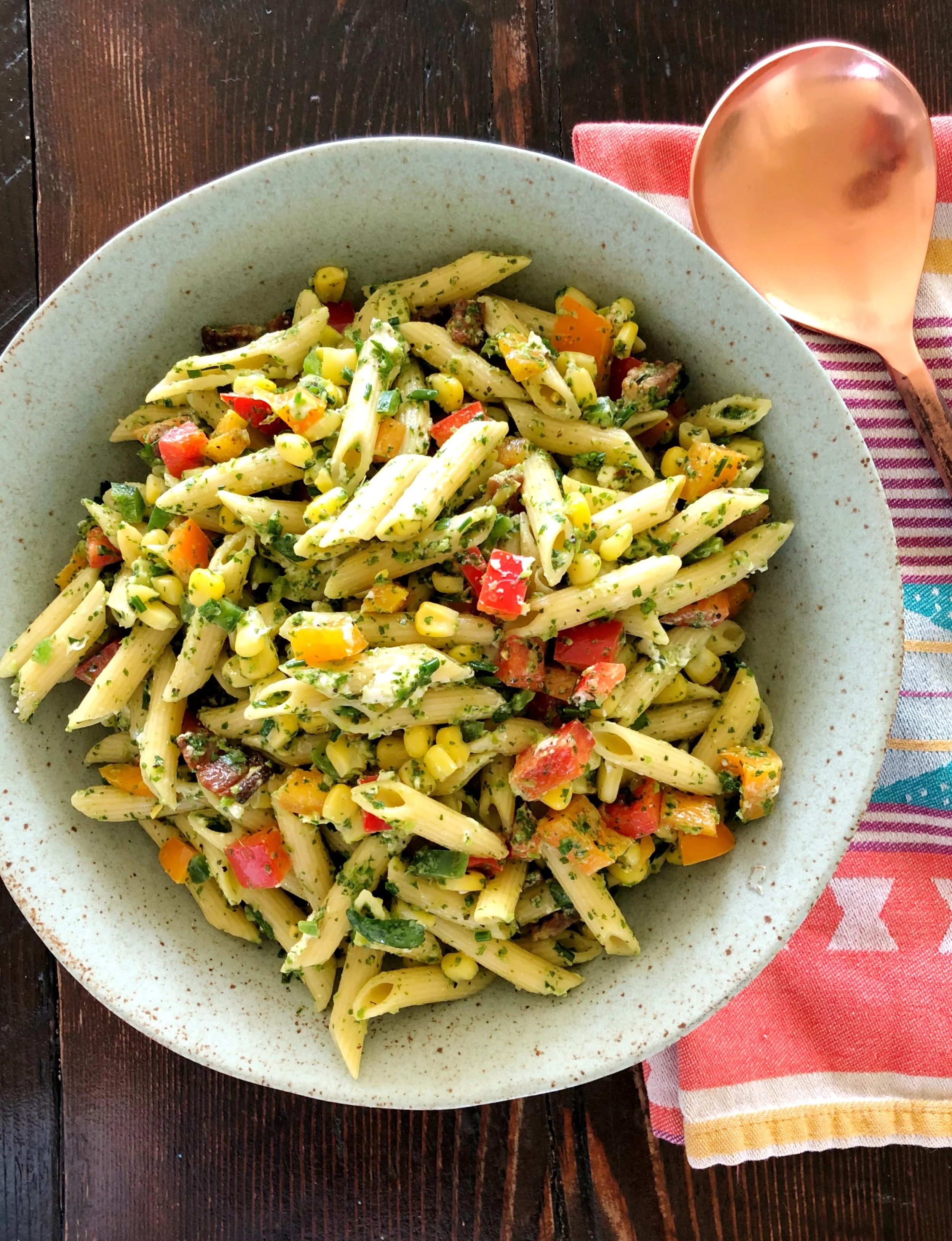 This year I’m bringing this easy and flavorful pasta salad. Penne pasta is combined with salty bacon, bell peppers, spicy jalapeno, green onions, tangy feta cheese and the most delicious cilantro vinaigrette. The result is a dish that easily feeds a big group and even better, is such a crowd pleaser you’ll find your people snacking on it well after the meal ends. It keeps exceptionally well in the refrigerator for a few days and because it’s not made with mayonnaise or other cream-based dressing, it’s ideal for a picnic or potluck. If cilantro isn’t your favorite, no problem. Skip the jalapeno in the salad and swap fresh basil leaves for the cilantro. Proceed with the recipe as called for.