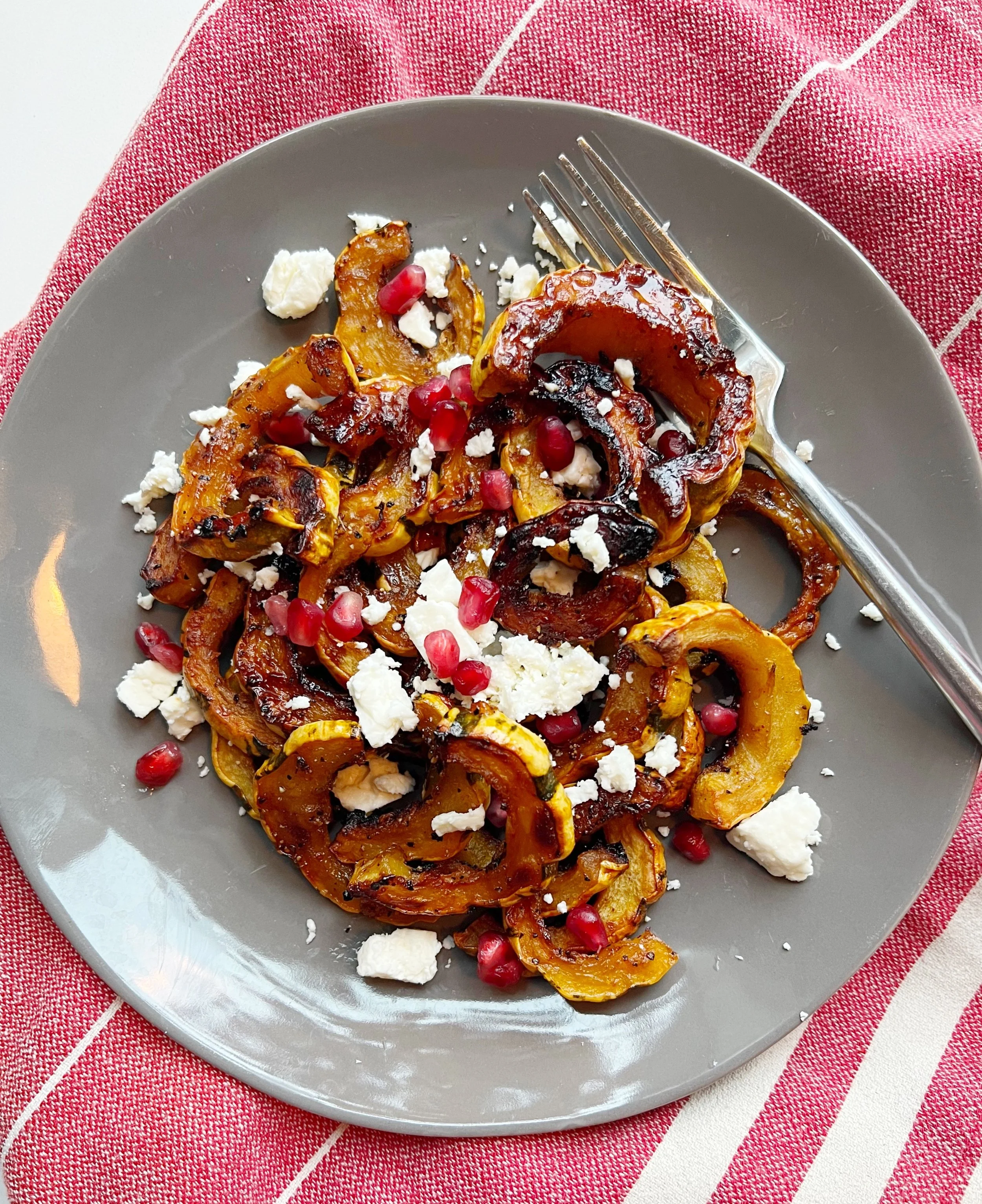 Roasted Delicata Squash with Feta and Pomegranate Seeds