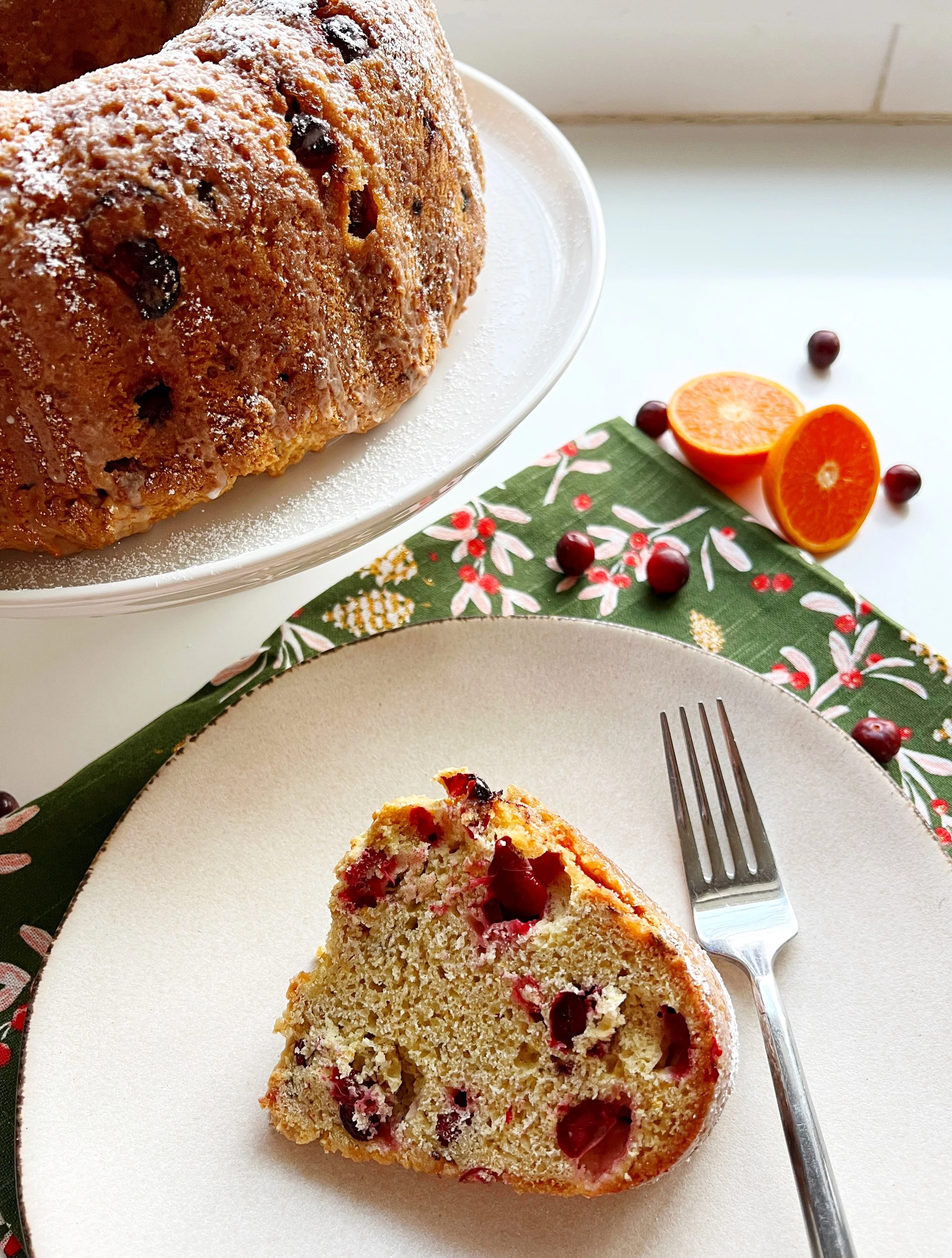 I love a bundt cake for the holidays because it’s so pretty and festive while at the same time, simple and easy to put together. This tender cake has a wonderful crumb and the sweetness of the orange and vanilla balance beautifully with the tart cranberries. Perfect for dessert with a dollop of whipped cream after a decadent dinner or even better the next morning as an extra special breakfast with coffee; this is a recipe not to be skipped this year.