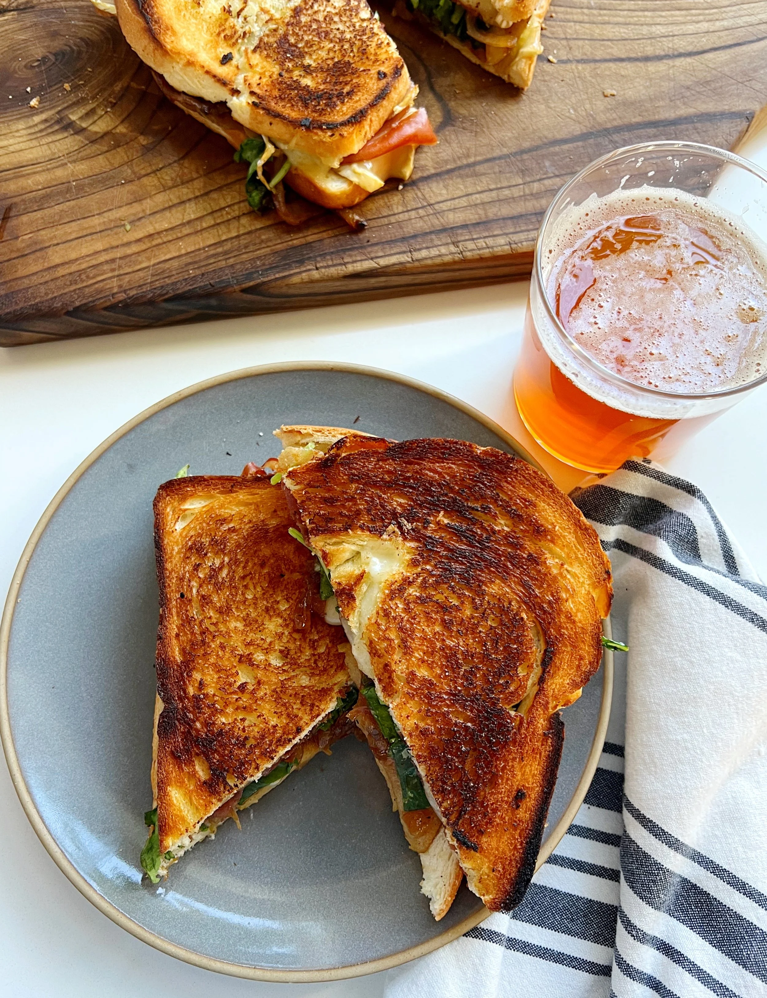 So to bridge the gap of summer and fall, I bring you an elevated grilled cheese. Apples and onions are sautéed in beer (and a little brown sugar and butter) until they are tender and caramelized. Layered with crispy prosciutto, melty brie cheese and peppery arugula, this is not your kid’s grilled cheese sandwich.