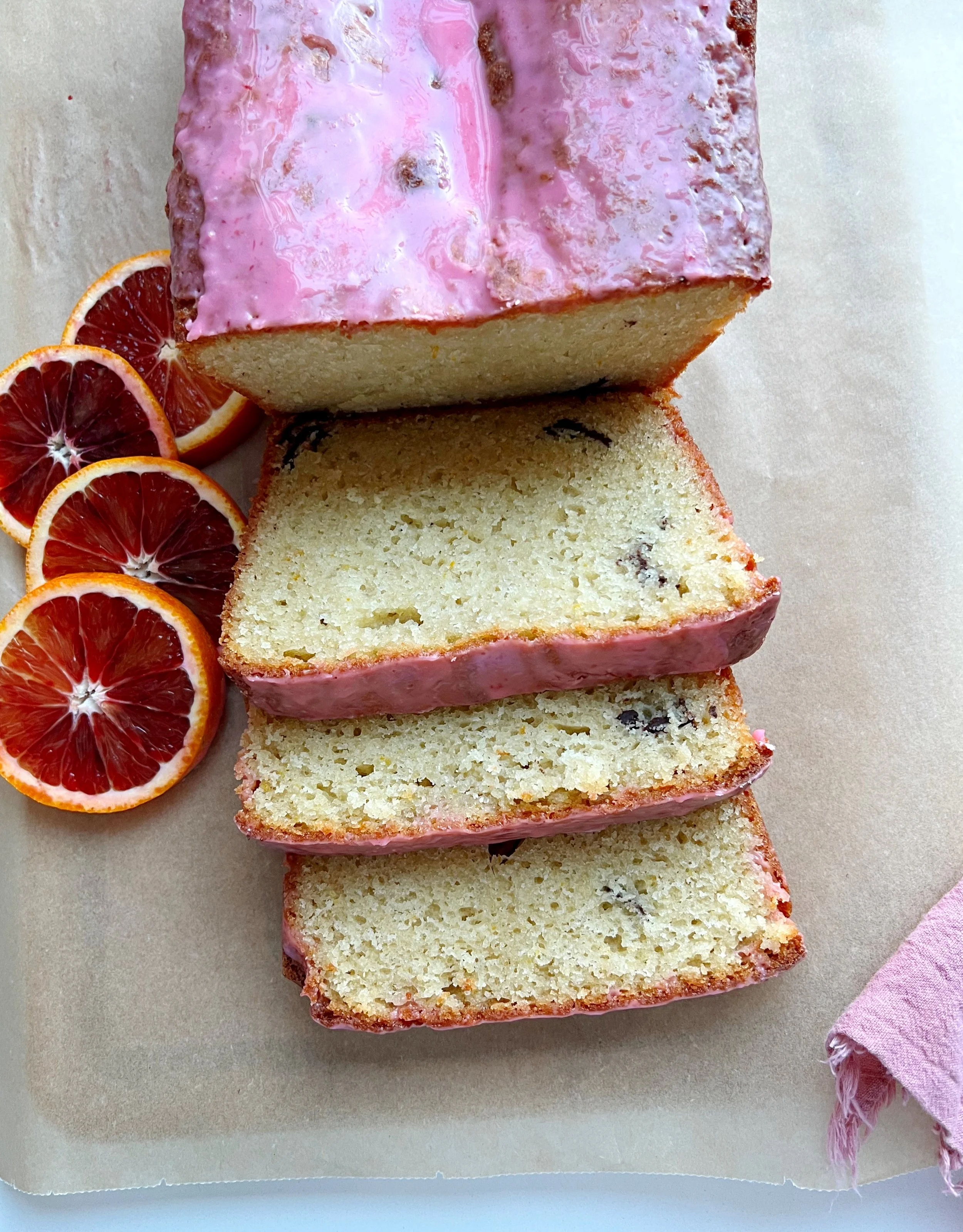 I was at the grocery store and noticed a big bag of blood oranges on special for $5. I didn’t think twice before throwing them in my cart. We ate lots of oranges as snacks the next few days, dripping bright pink juice down our arms every time we ate them. But I couldn’t resist turning a few of them into a sweet dessert. I had a bar of dark chocolate lingering in the pantry which was the inspiration for this recipe. Orange and chocolate are a favorite combination for me and I couldn’t resist the beautiful dark red color of the blood oranges. A simple yogurt loaf cake turns into something truly special with blood oranges and slivers of dark chocolate bar. An easy glaze of orange juice and powdered sugar makes the prettiest pink frosting and what takes just a few minutes to throw together ends up a special and super delicious treat.
