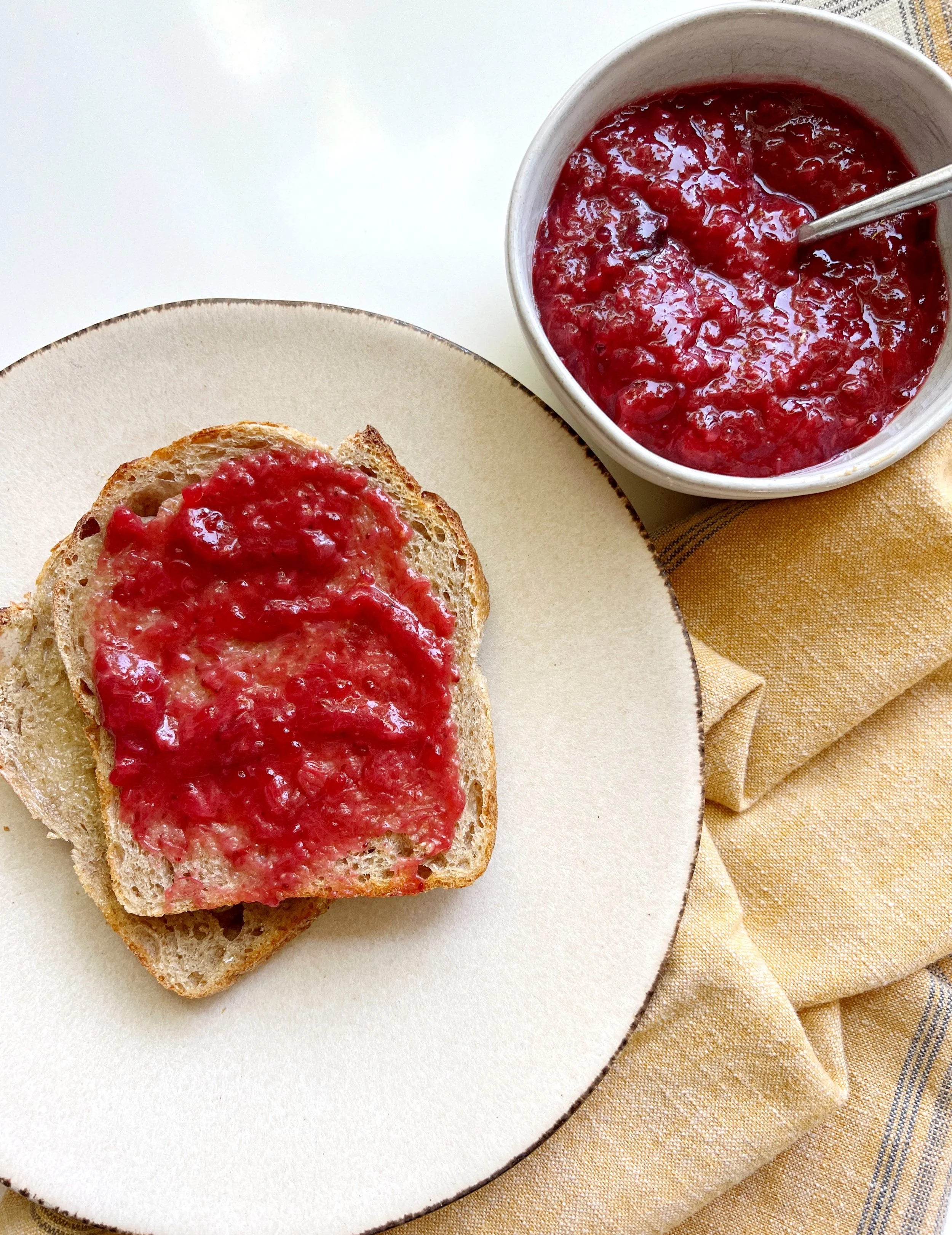 This is ‘freezer’ jam, in that I did not add pectin or formally can this recipe. I simply made the spread on my stove and then stored in my refrigerator. The lemon juice will help preserve the fruit and the jam can be stored for up to two weeks in a lidded jar in the refrigerator or up to two months in the freezer.