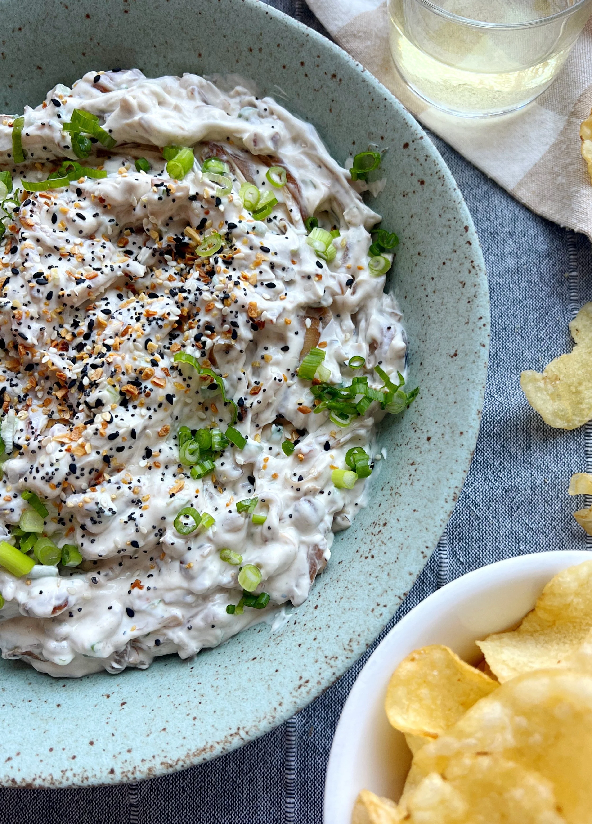 Combine the caramelized onions, bacon and green onions with the sour cream mixture along with the juice of half a lemon. Give the dip a good stir and add another pinch of salt and pepper. Garnish with a generous sprinkle of Everything But The Bagel seasoning, minced flat leaf parsley and the remaining two tablespoons sliced green onions. Serve with crunchy kettle potato chips.