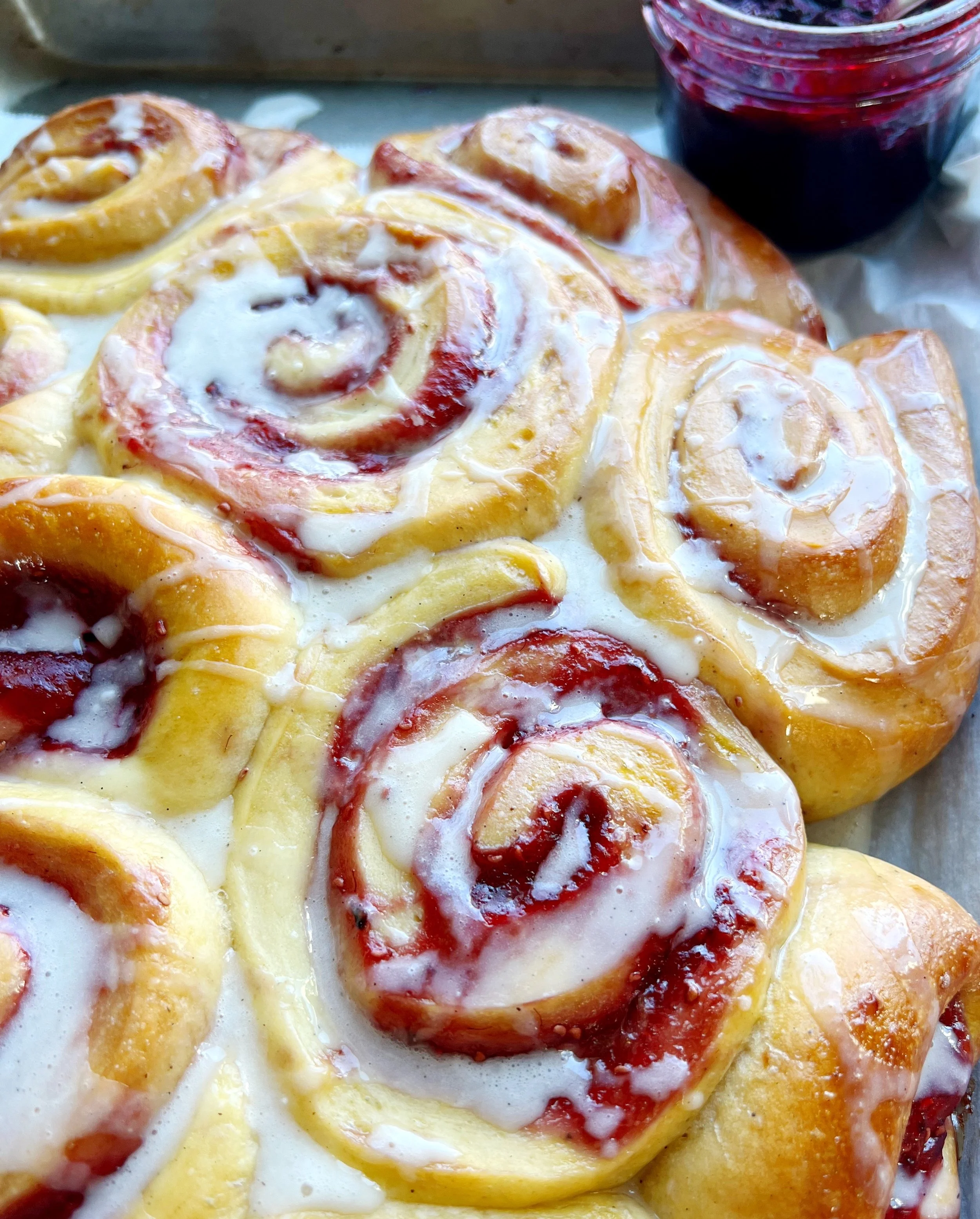 Bake the buns for 25 to 35 minutes (depends on the size of the buns). They are done when the the jam is bubbly and caramelized and the tops are golden brown. While the buns bake in the oven, combine the powdered sugar, half and half and vanilla, whisking to combine. Generously drizzle the vanilla glaze over the warm buns. Serve immediately while they are warm!