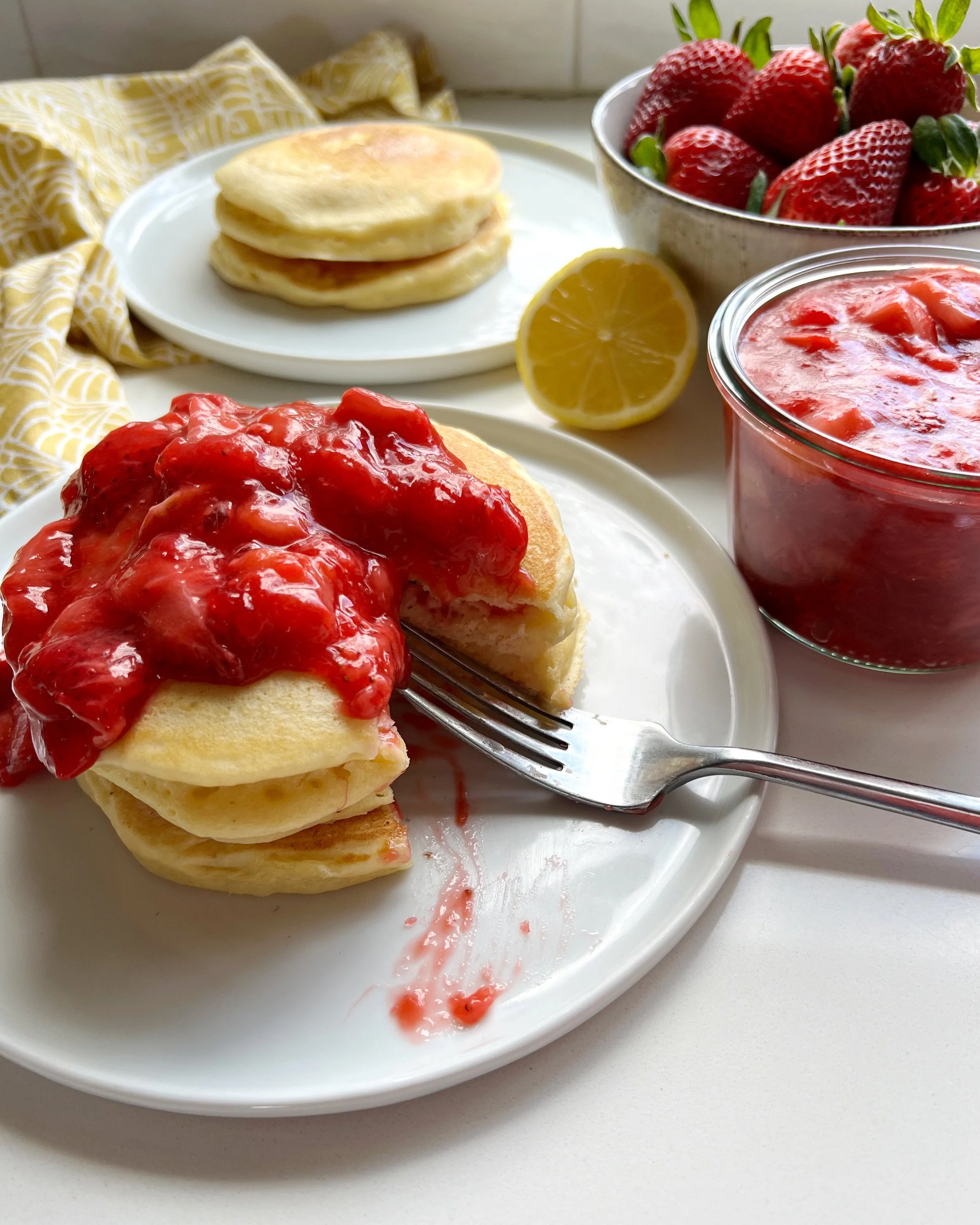 This recipe would be perfect for a lazy weekend morning. The pancakes and compote come together in less than 30 minutes, making for a lovely brunch on a sunny spring morning.