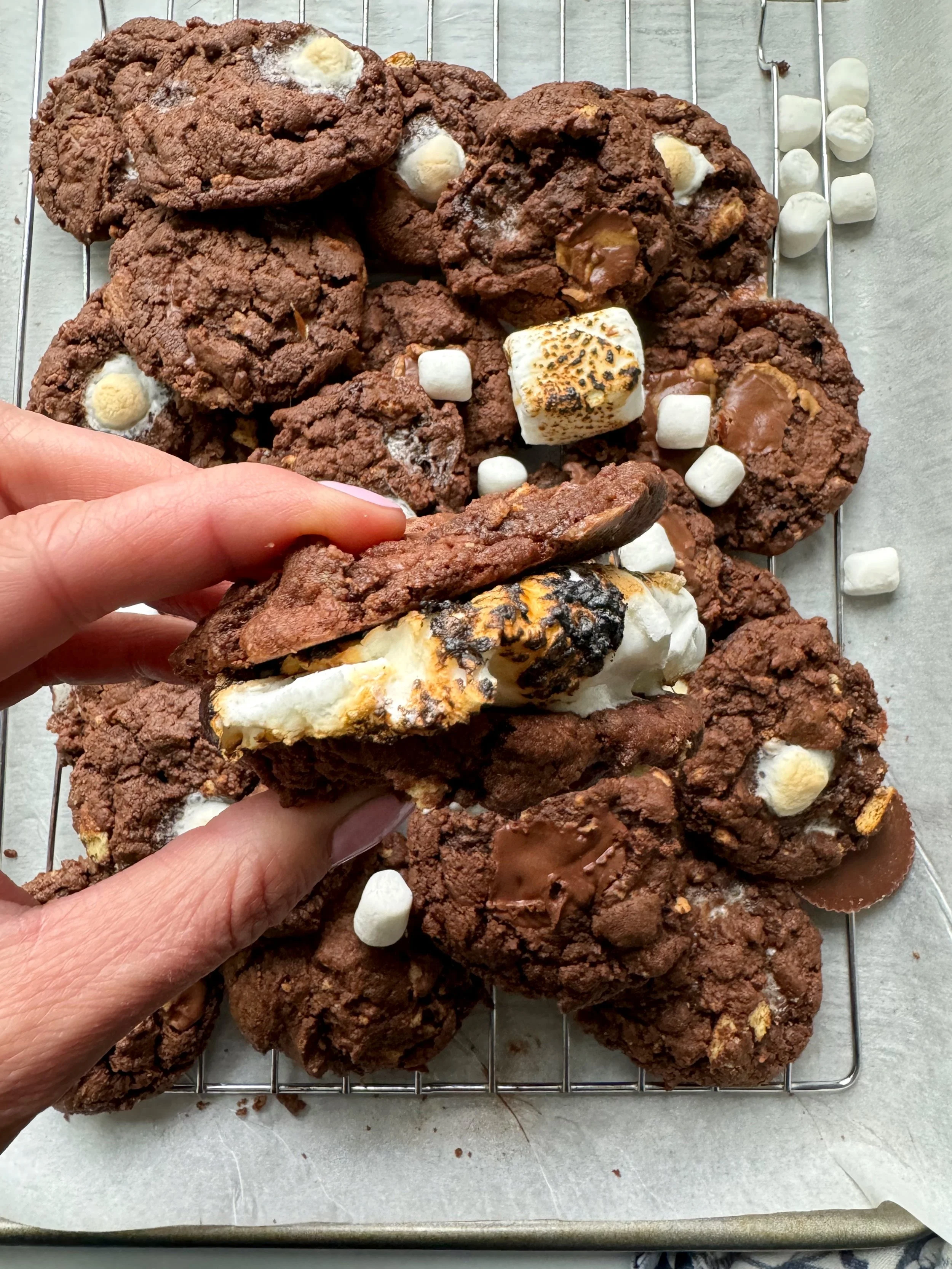 For S’mores: Roast marshmallows over an open flame until toasted and golden brown. Make a sandwich with two chocolate peanut butter s’mores cookies and the toasted marshmallow.