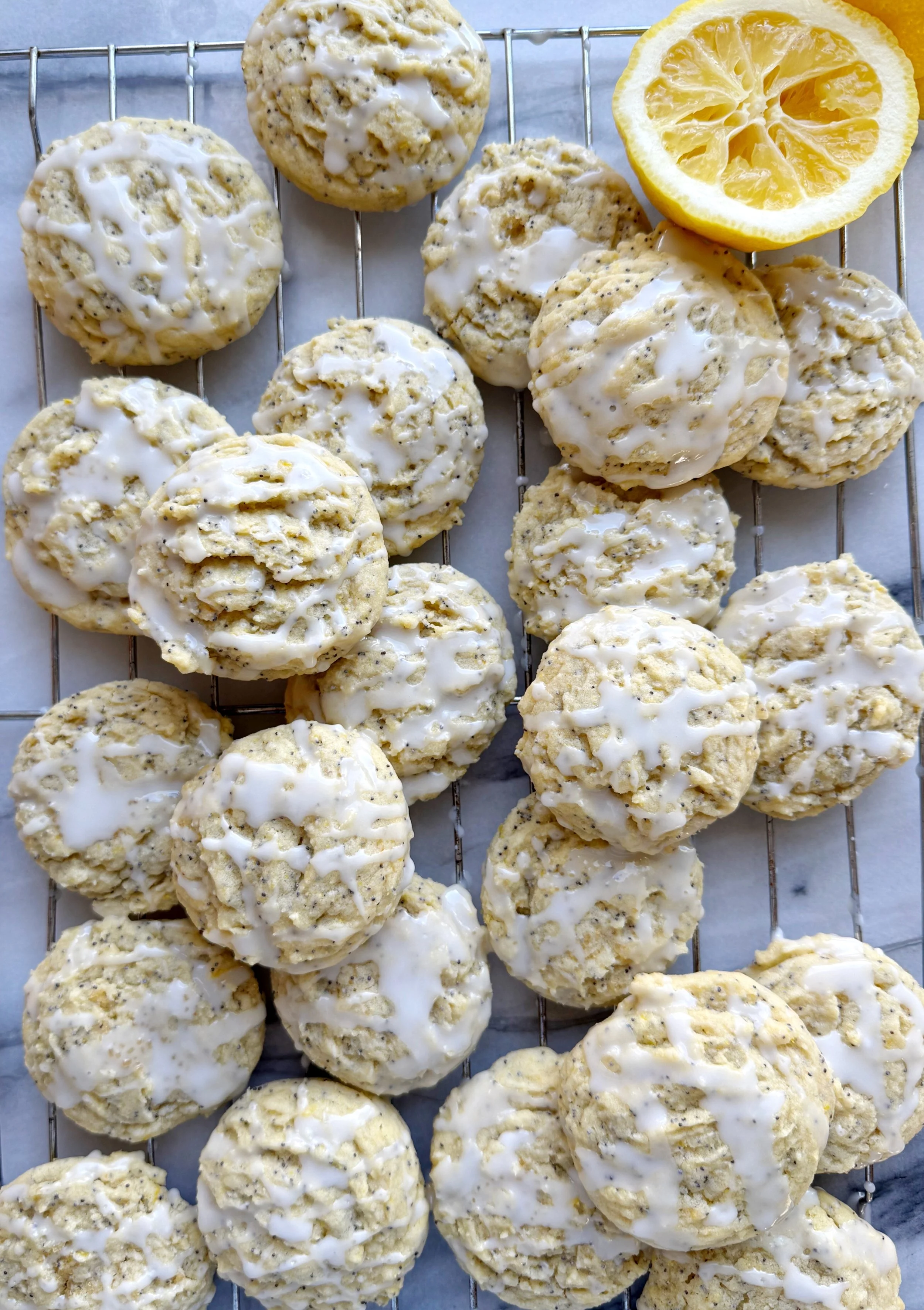 Growing up, there was a coffee shop near my high school that sold giant lemon poppyseed cookies with a thick layer of lemon icing. I wasn’t ready to commit to an entire batch of icing, but this sweet and super simple glaze, gives the cookie that little something extra for not a lot of effort. If I was planning to gift these or take them to a party, I would sprinkle the cookies with a bit of raw sugar and extra lemon zest before the glaze set for an extra special touch.