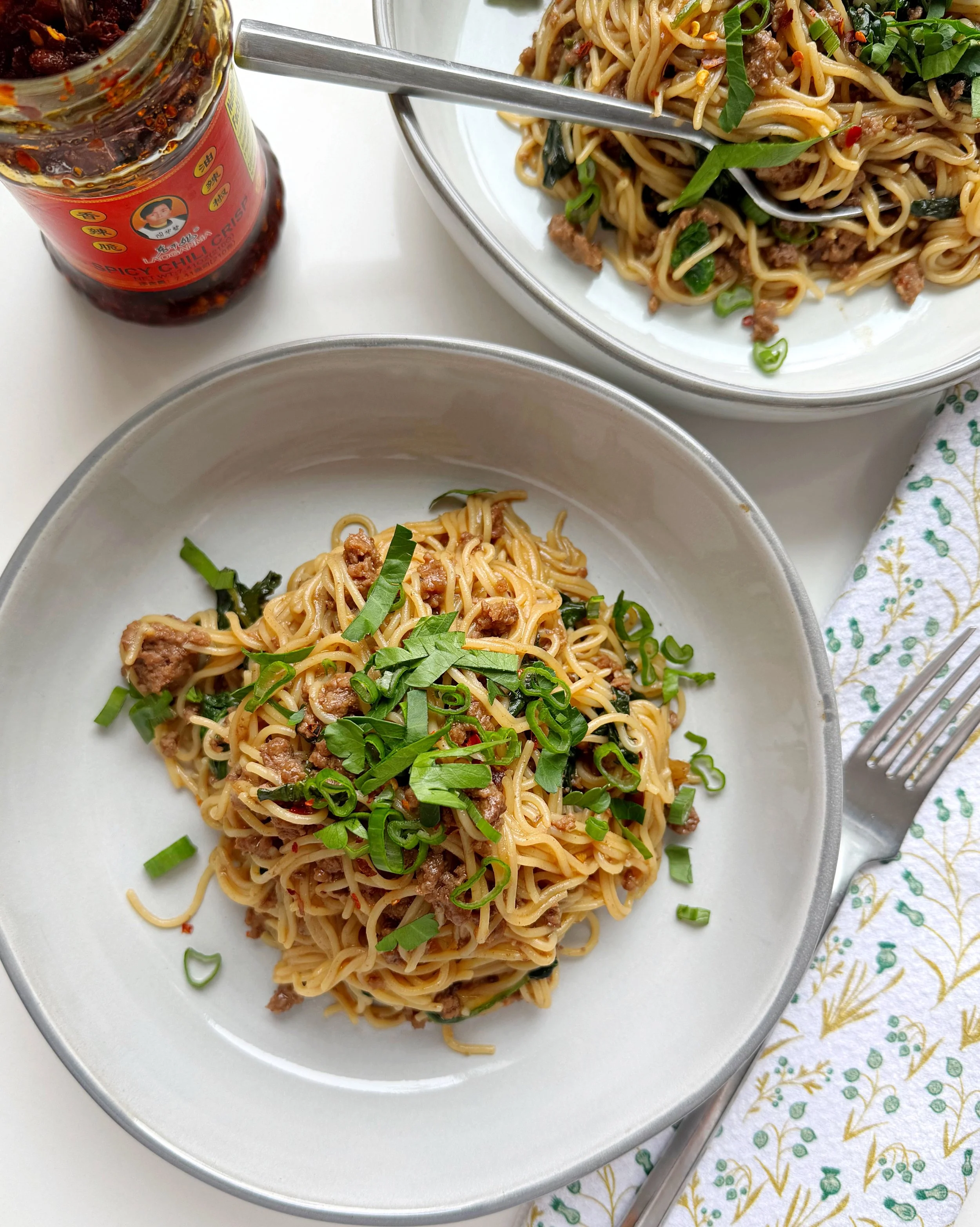 Remove the pan from the stove and combine with the ramen noodles, stirring until the noodles are well-incorporated. Scoop generous portions into a shallow bowl or plate. Garnish with minced green onion and cilantro. For a spicy kick, top each serving with a spoonful of chili crisp. Enjoy!