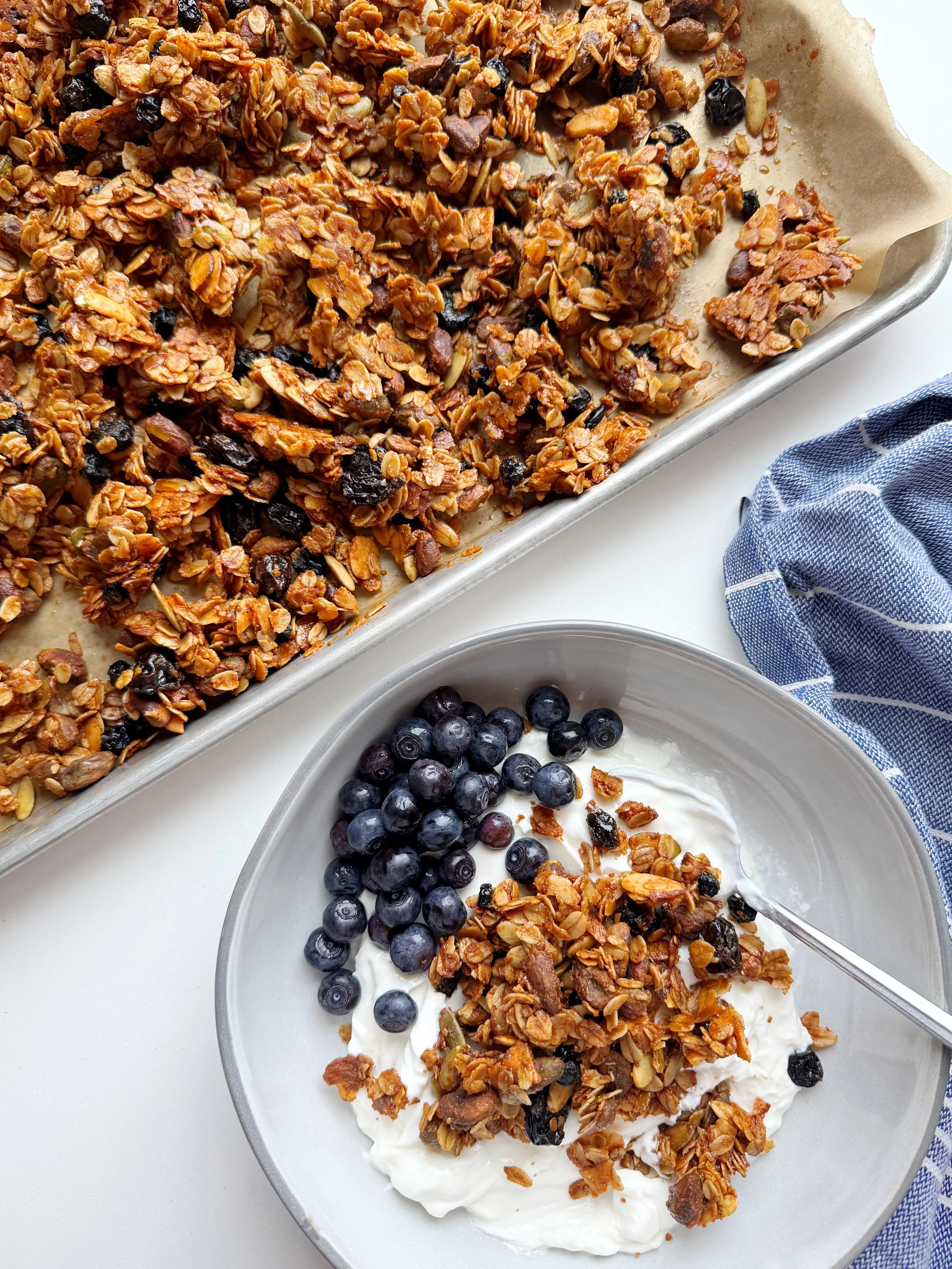This blueberry pistachio version came together from what I found in my pantry and I can guarantee I’ll be making this recipe again and again. And the very best part? How adaptable it is. I used tahini the first time I made it but crunchy peanut butter the second time. Any nut butter will work just fine. You can also swap the honey for pure maple syrup if you prefer or have that on hand. The key is to combine a meltable fat (coconut oil) with a liquid sugar (honey) and a nut butter. The result is a sticky, hearty, delicious granola you’ll want to have on hand all spring long.