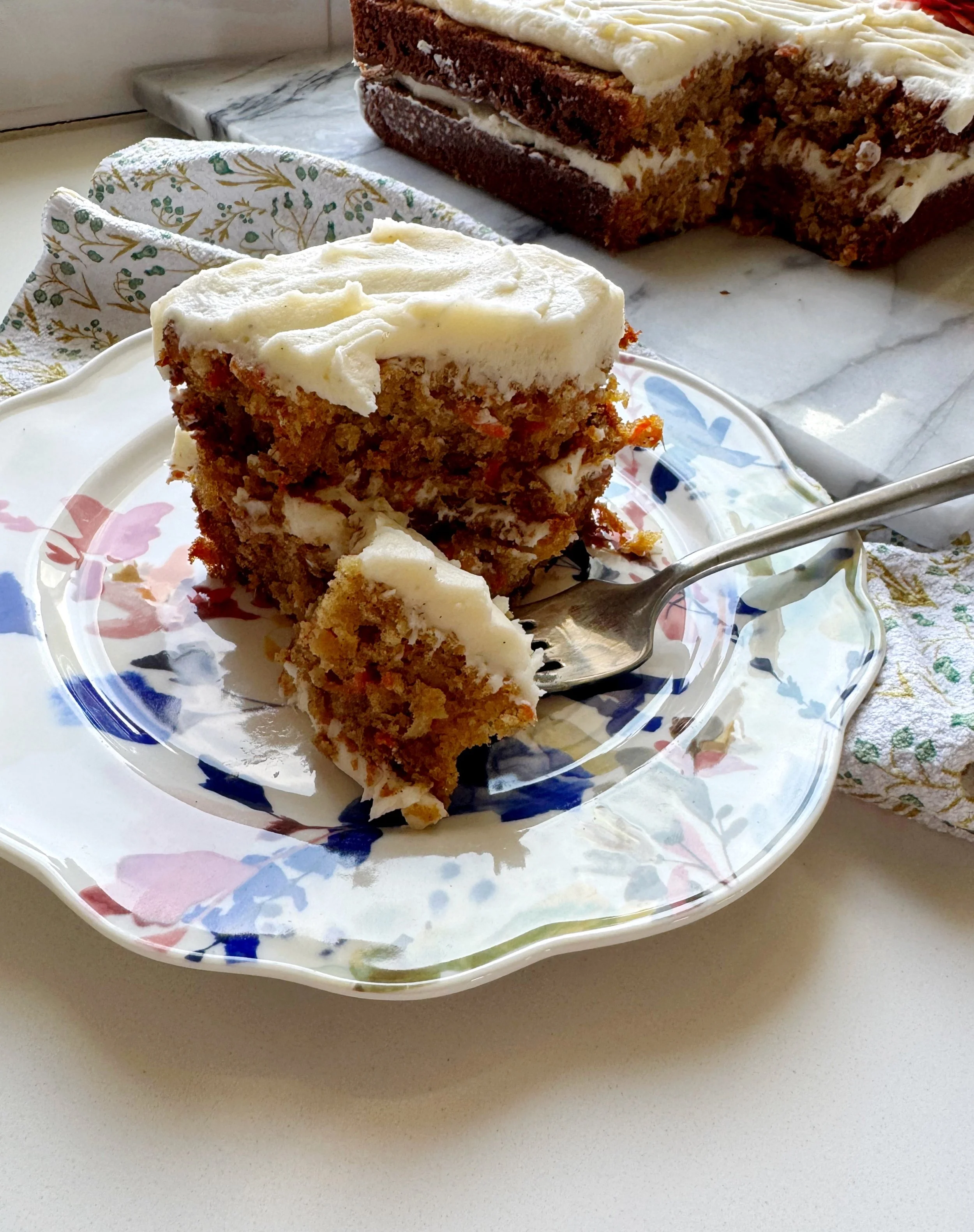 For some reason, spring always seems like the perfect time to make a carrot cake and I usually make at least one every spring for Easter or Mother’s Day. Sometimes I make a round layered cake and other times a sheet cake (much easier to frost and decorate, although maybe not as exciting of a presentation). This year, I used one large square cake pan and turned it into a simple layer cake.