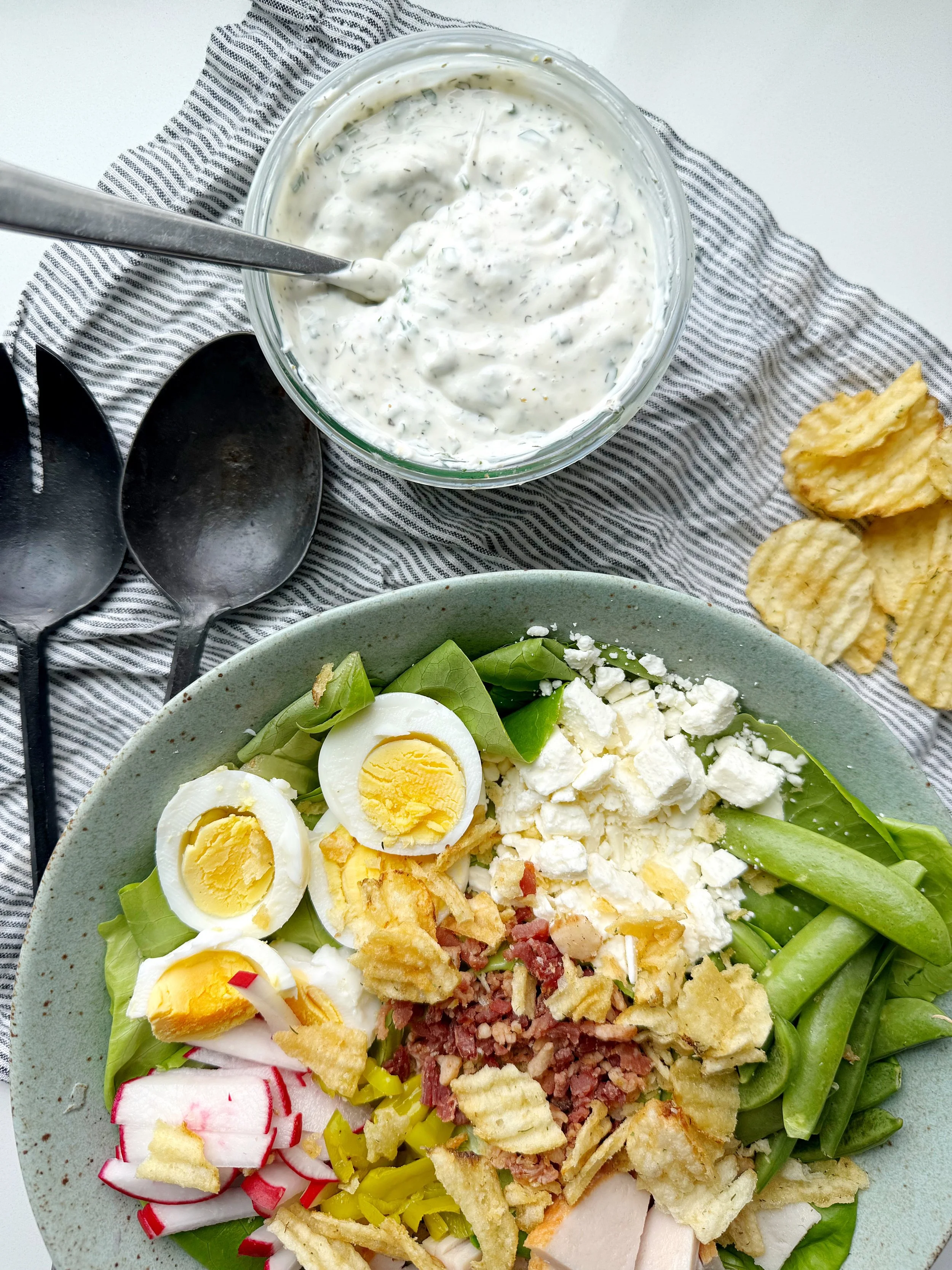 For the salad, layer a large shallow bowl with the butter lettuce, then top with the hard boiled eggs, bacon, radishes, snap peas, deli meat, feta cheese and pepperoncini peppers. Spoon the dill pickle ranch dressing over the salad and mix well to combine. Garnish with a generous handful of crumbled dill pickle kettle chips.