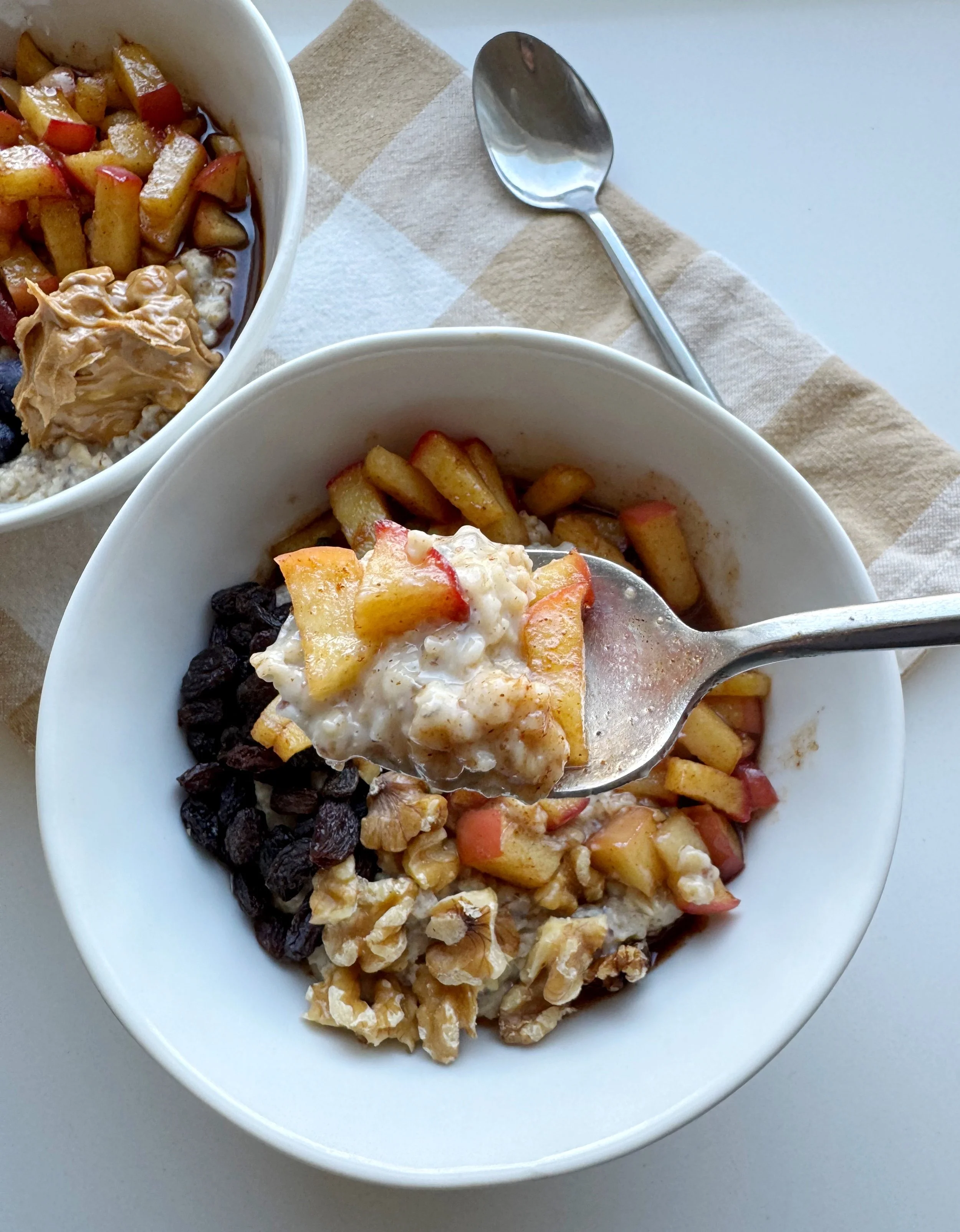 Apples are caramelized in butter and brown sugar until tender and full of flavor. The combination of milk and water makes this batch of oatmeal rich and creamy without being heavy and I can’t make oatmeal any other way anymore. The rest of the toppings vary week to week. My teens love a big scoop of peanut butter while I prefer mine as close to the original way I had it in Scotland: oats, apples, blueberries, raisins and walnuts.